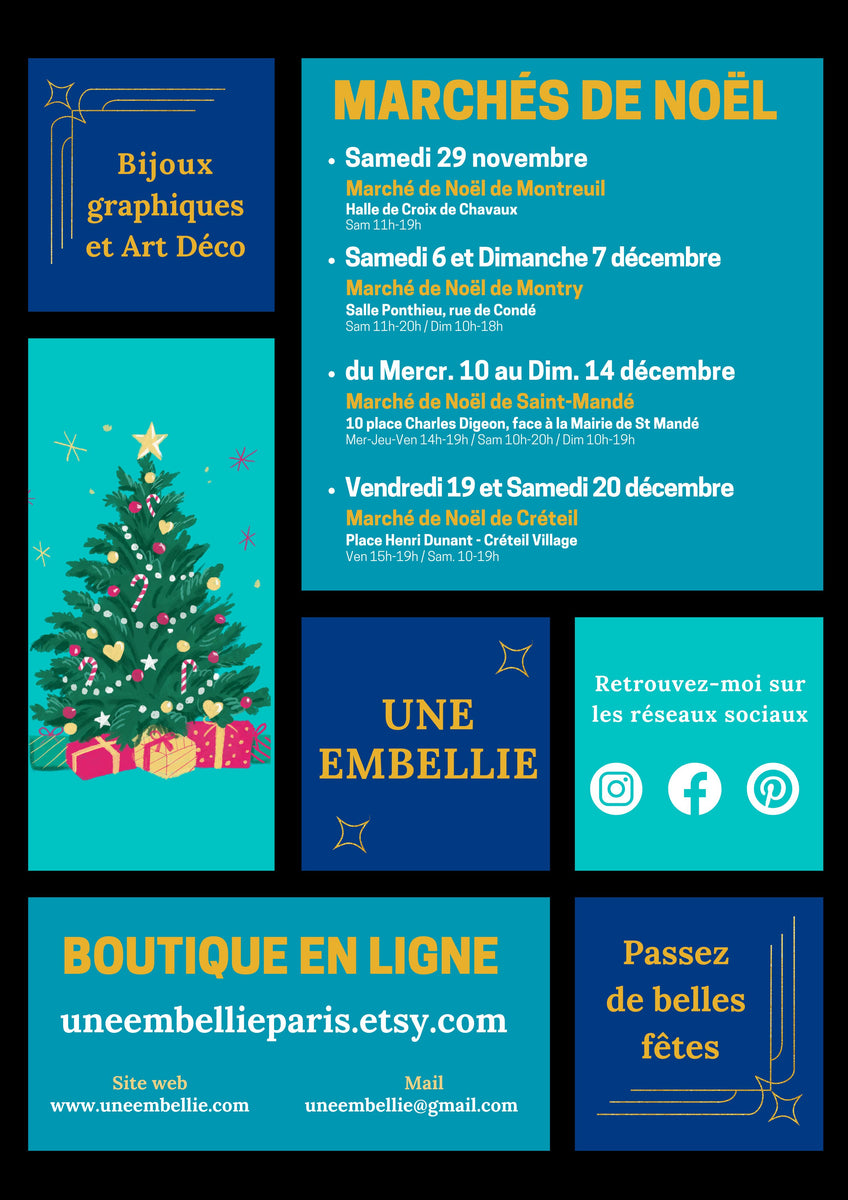 Les festivités de fin d'année approchent et pour l'occasion les bijoux Une Embellie sont de sortie! Si vous souhaitez découvrir, voir toucher et essayer les bijoux pour de vrai alors voilà les différents marchés de Noël où je serai présente!