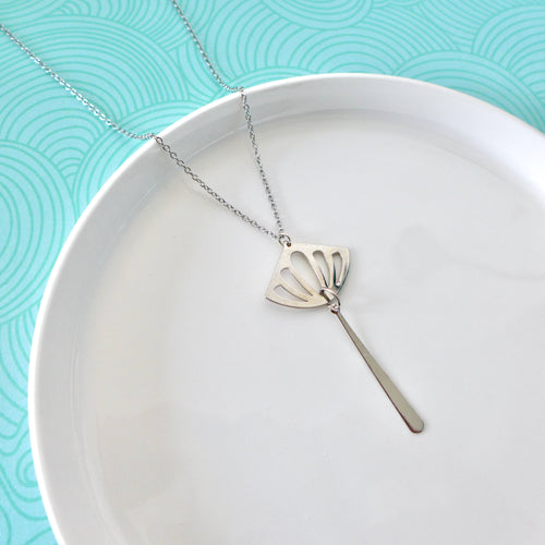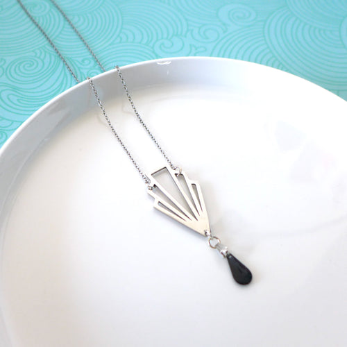 Collier Art Déco pendentif éventail graphique acier inoxydable argenté et sequin émail noir
