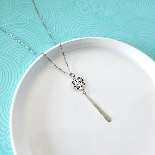 Collier élégant pendentif rosace graphique et longue goutte fine en laiton argenté